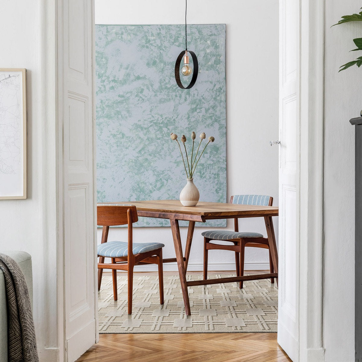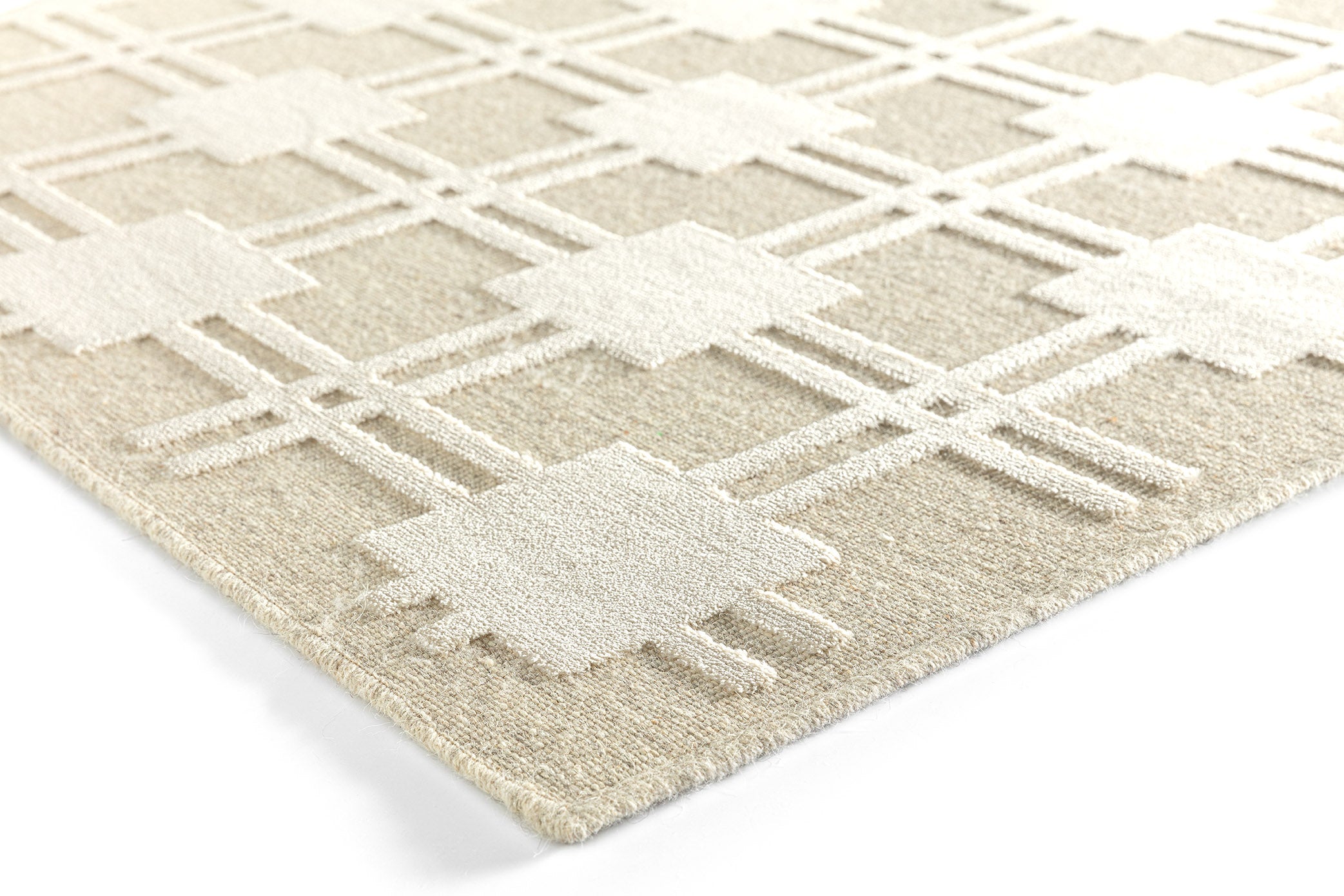 Stel je voor dat je je eetkamer, woonkamer of slaapkamer binnenstapt, begroet door de zachte, uitnodigende textuur van dit prachtig geweven stuk. Het geometrische ontwerp voegt een moderne touch toe, waardoor het perfect is voor Scandinavisch geïnspireerde interieurs.