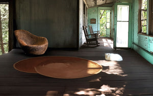 De tinten roest, bruin en taupe vloeien subtiel in elkaar over, alsof ze met penseelstreken op wol geschilderd zijn. Het resultaat is een sculpturaal tapijt dat meer weg heeft van een kunstwerk dan van een gebruiksvoorwerp.