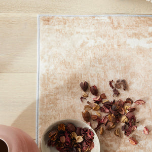 De Liberty LIB105 Spring straalt een zachte, warme rust uit: poederroze tinten, lichte zandnuances en subtiele groentonen vloeien in elkaar over alsof ze met brede penseelstreken zijn aangebracht. Het vloerkleed is dun, soepel en opvallend licht, waardoor het ideaal is voor interieurs die een serene basis zoeken zonder overweldigend patroon. Het lage profiel schuift moeiteloos onder deuren en meubels en voelt uitnodigend zacht onder de voeten.