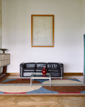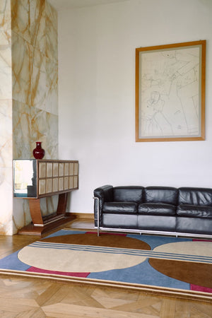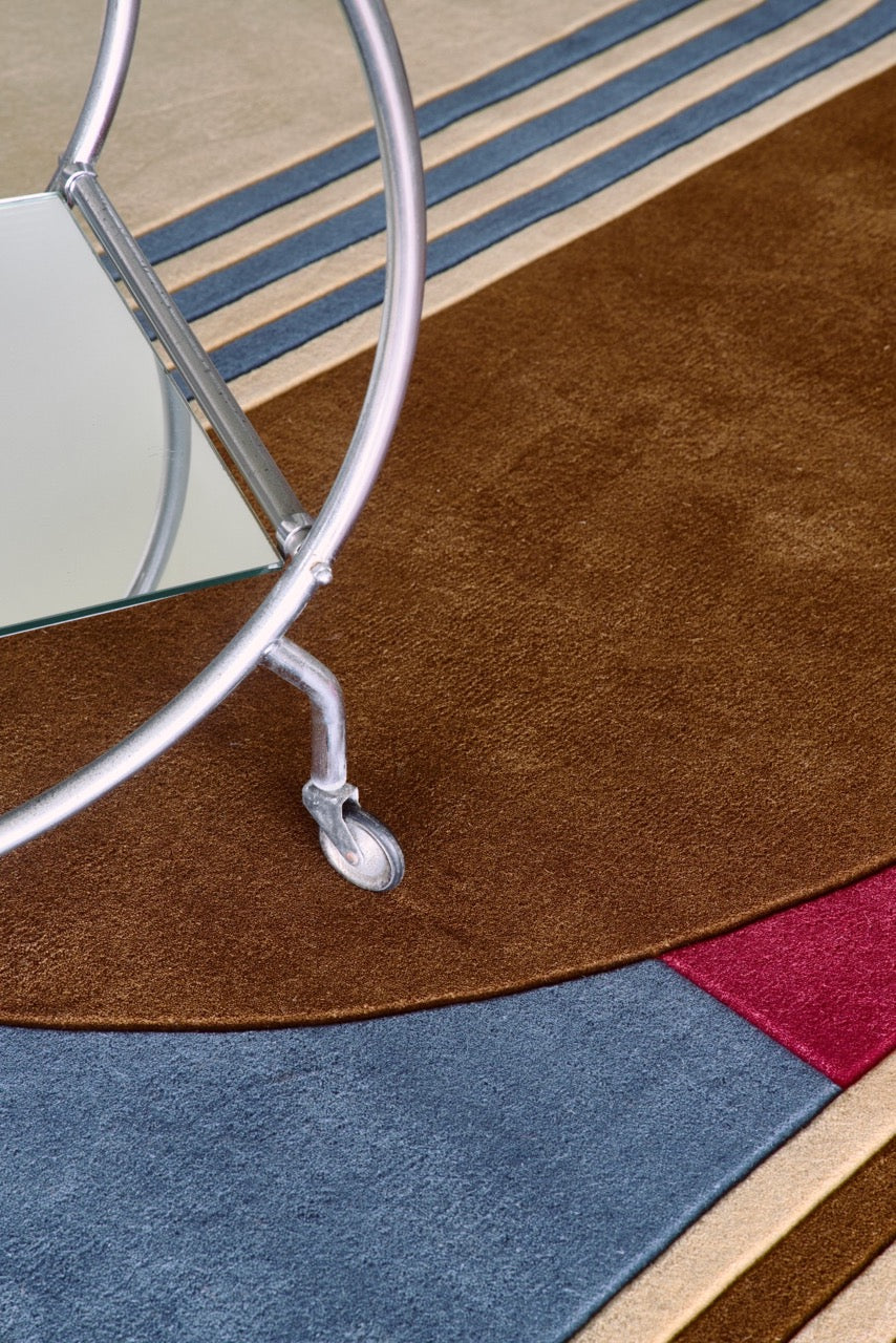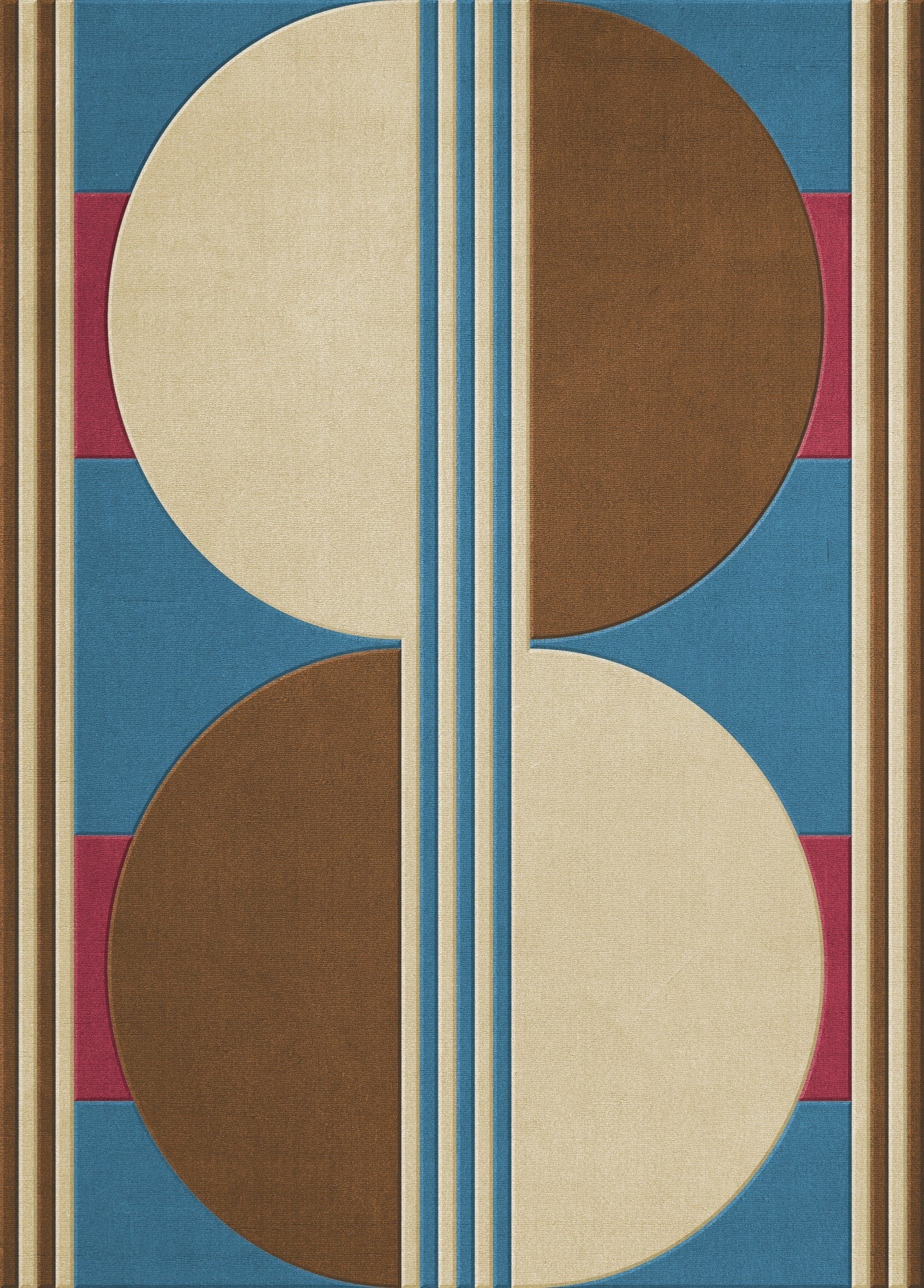 De Layered Gio Mezza Confetto voelt aan als kunst op de vloer, maar dan op een manier die je elke dag graag ziet liggen. Het ontwerp is strak en geometrisch, met een duidelijke retro knipoog, terwijl de kleuren net heel zacht en stijlvol blijven. Zachtblauw, warme bruintinten, crème en een subtiel confetto-roze accent zorgen voor een mooie balans tussen speels en volwassen.