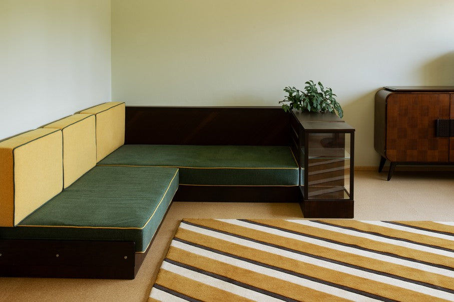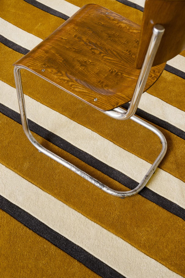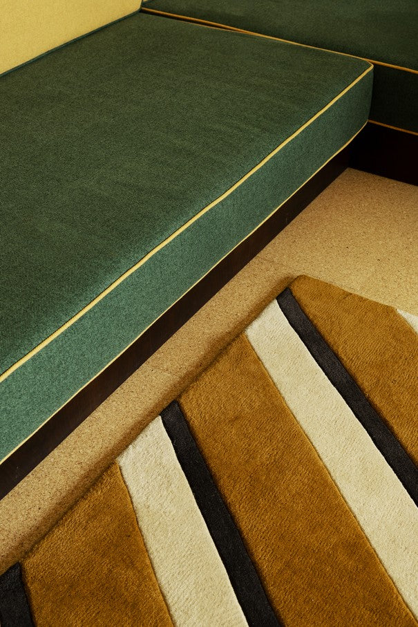 Het kleed is handgetuft in hoogwaardige wol en combineert Scandinavische vormtaal met grafische precisie. Dankzij het warme kleurenpalet is dit design opvallend maar toch makkelijk te integreren – prachtig in combinatie met natuurlijke materialen zoals hout, linnen en leer, of als krachtig contrast in een modern interieur.