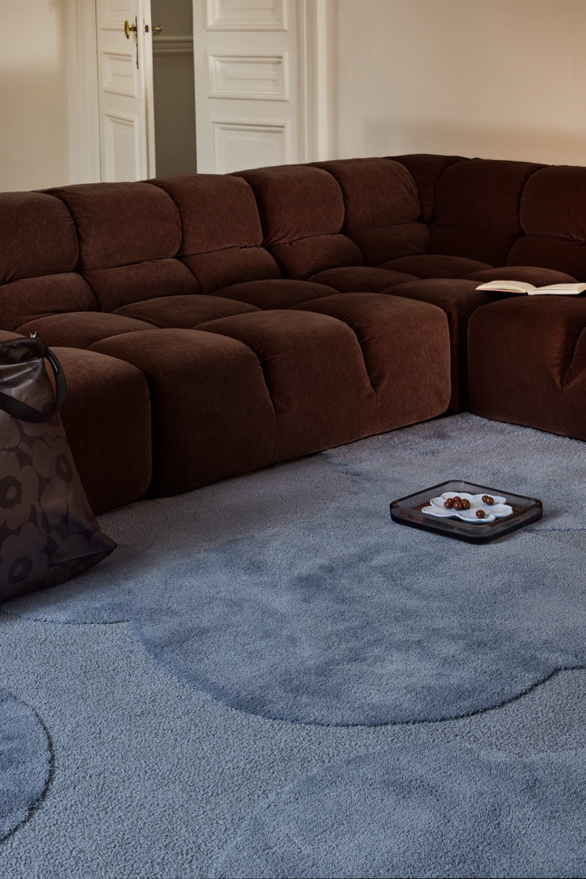 Combineer Iso Unikko Dusty Blue met strakke meubels, lichte houtsoorten en rustige textielen om het Scandinavische karakter te versterken. Ook in interieurs met donkerdere meubels werkt dit vloerkleed mooi als verzachtend contrast.