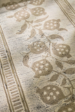 Het Sanderson Anaar Flax 148001 vloerkleed brengt de zachte elegantie van de natuur naar binnen. De handgetufte tekening met gestileerde granaatappels en bladeren straalt een kalme verfijning uit – typisch voor het Britse merk Sanderson, dat al jaren symbool staat voor tijdloze charme en subtiele kleurharmonie.